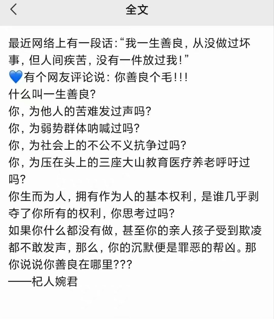 想作恶就放开手去做,需要能说服自己的理由吗 现在为什世风日下,说白了就是群体效应,都是这么想的,反正没人善待我,所以我也不去善待别人 久而久之,整个社会环境恶化了,到头来倒霉的还是普罗大众,有钱有势的人横竖都不会倒霉的好吧 善良 不等于 不会保护自己,罩子放亮,离开那些别有用心的人很正常 当然,说句难听的,普通人越是这么卷,精英圈子越是封闭,国家自然是精英话语权最大,直白了说,国家的政策和法律只会和普通人越来越脱节。 你以为,国家会通过教育来改善下一代吗?不可能也不现实。物理学家马克思普朗克早年在发表黑体辐射的论文的时候就说过,“你的理论变成对的,不是因为你说服了别人,而是因为你的反对者终于都死了”。 精英巴望着社会越来越恶劣呢,他们才懒得做什么榜样,底下人一个个都卷死了,不就是精英那套所谓的“精致利己”行得通的最好的广告么。(滑稽一下:什么叫“精致利己”?人都利己的好吧,别说人了,单细胞细菌都利己的。人家精英那个生活水平,当然精致。) |